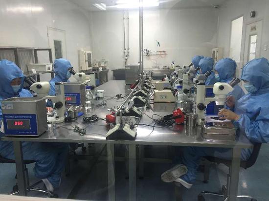 技術人員在密閉實驗室內對眼科產品進行超聲波清洗。聶晨靜 攝