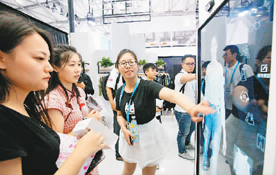 在上海2017年亞洲消費(fèi)電子展上,參觀者在體驗一款可與電商平臺網(wǎng)絡(luò)連接實現(xiàn)試穿下單一體化的智能穿衣鏡。新華社記者方喆攝