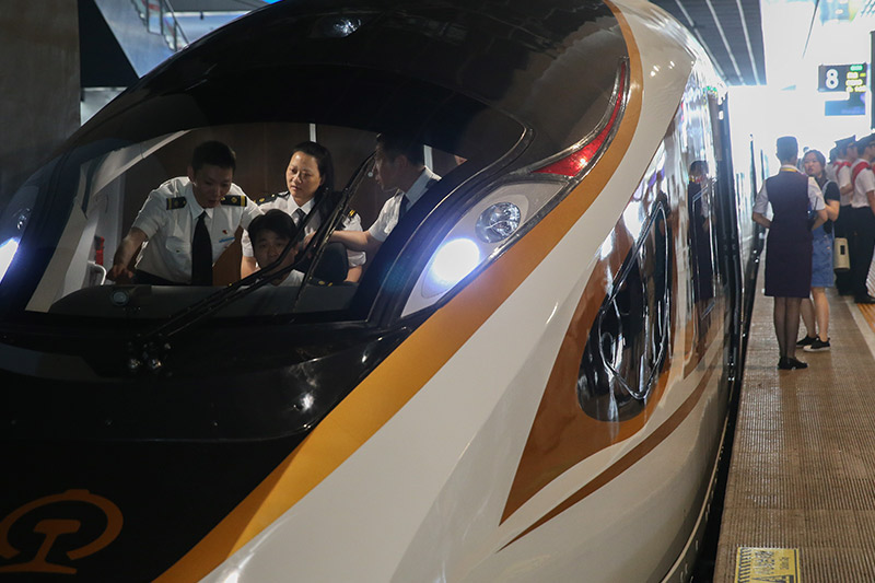 6月26日,在上海虹橋火車站,工作人員在“復興號”G124次列車駕駛艙內進行發車前的準備。“復興號”是由中國鐵路總公司牽頭組織研制、具有完全自主知識產權、達到世界先進水平的中國標準動車組。