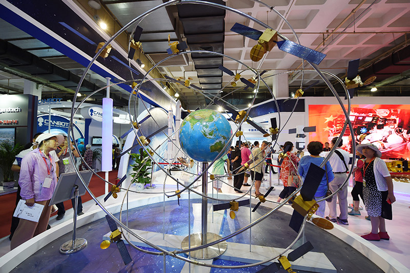 6月9日,參觀者在第二十屆中國北京國際科技產業博覽會上參觀展出的北斗衛星導航系統模型。