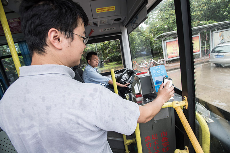 6月15日,一名乘客在湖北武漢用手機刷支付寶搭乘公交車。