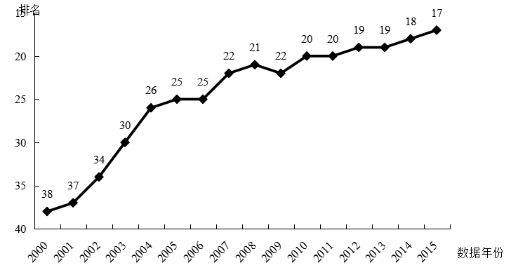 在40個參評國家中,中國國家創新指數綜合排名比上年提升了1位,繼上年超越澳大利亞之后,今年又進一步超越比利時,位居第17位。這表明我國國家創新能力繼續穩步提升(見圖1)。