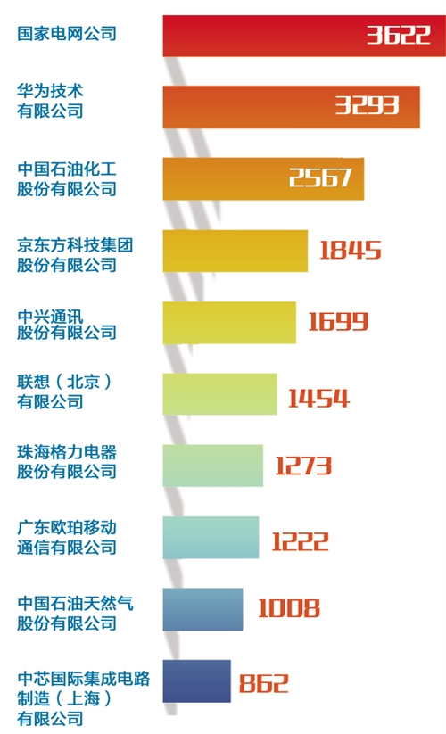 此外,作為研發密集型企業的代表,中芯國際集成電路制造(上海)有限公司也憑借授權862件發明專利躋身十強。“這表明企業只要重視創新,加大專利保護和運用,也能后來居上。”蘇平說。