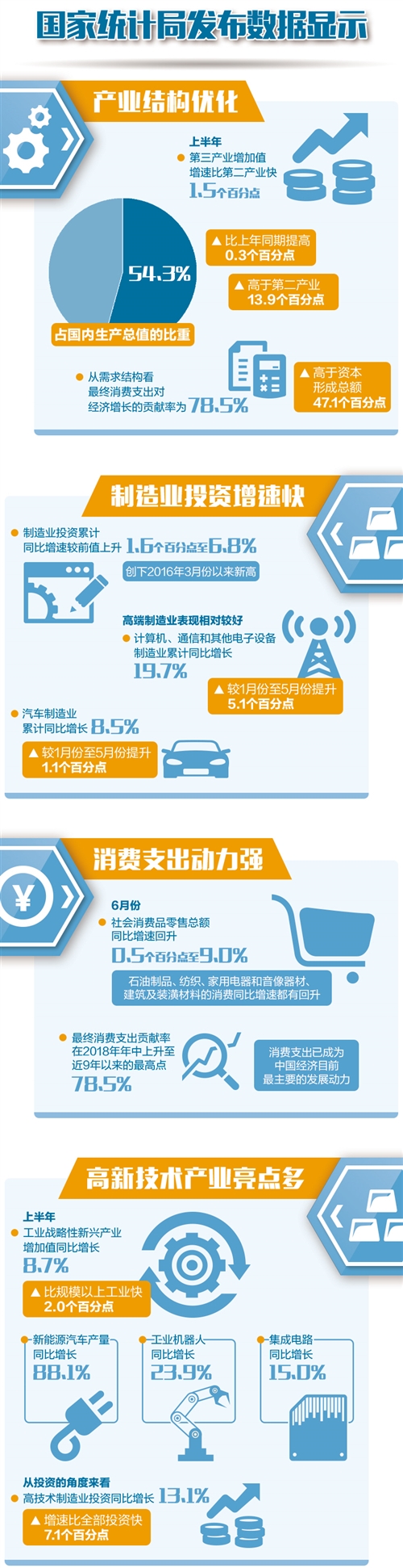 上半年國民經濟總體平穩、穩中向好。其中,消費支出、產業升級和制造業投資成為結構調整中的亮點,為奮力前行中的中國經濟提供了穩定的支撐。